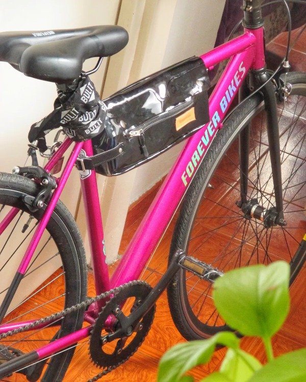 Características: 4 bolsillos divisores dos internos y externos, material cuerina impermeable, solapa con botones apliques y correa regulable para sujetar en el caño del cuadro manteniendo todo en su lugar al andar ..